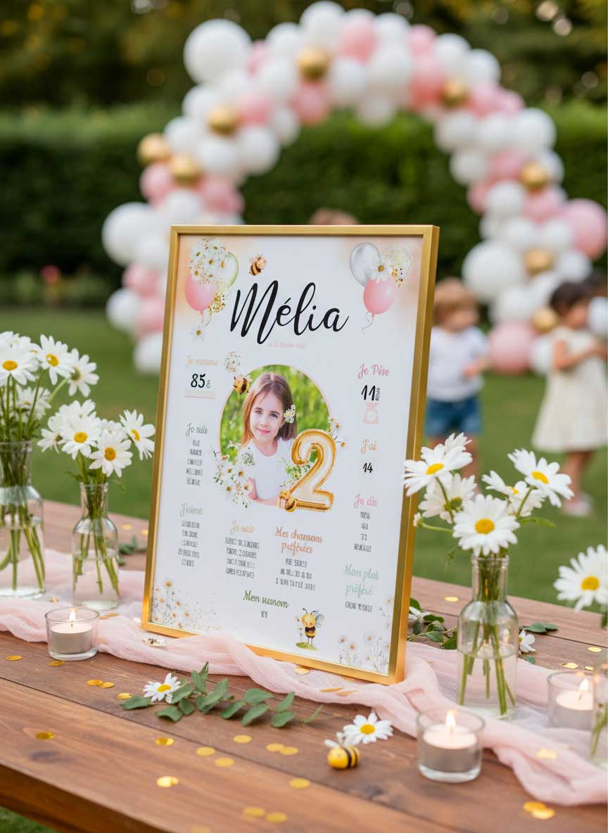 Affiche anniversaire fille.Thème Marguerite et abeille