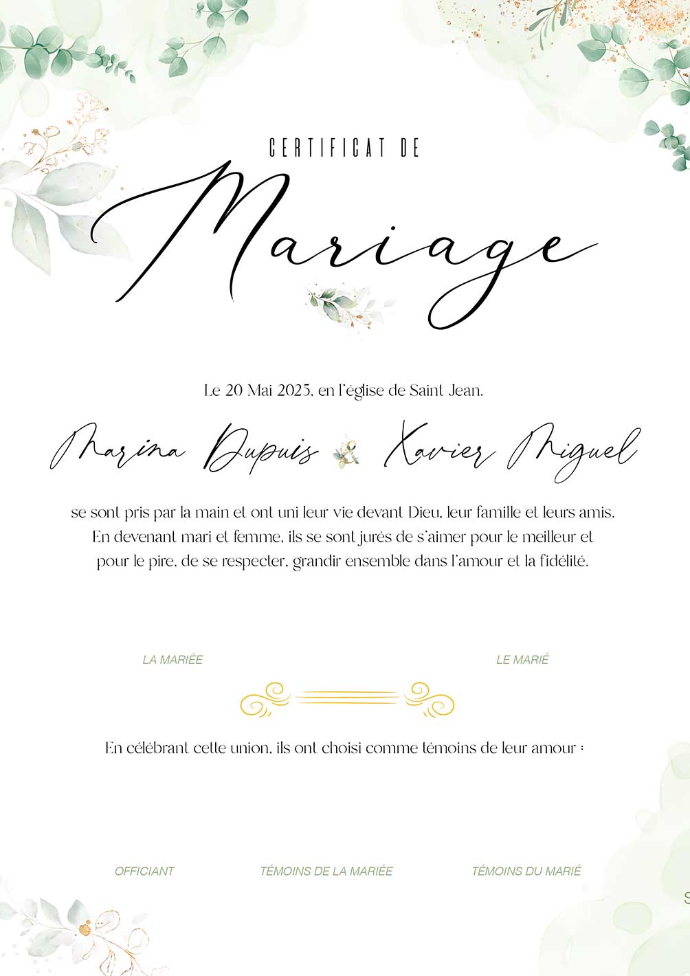 Texte pour le certificat (lieu & date, prénoms et nomes des mariés mais aussi témoins et officiant si besoin ).