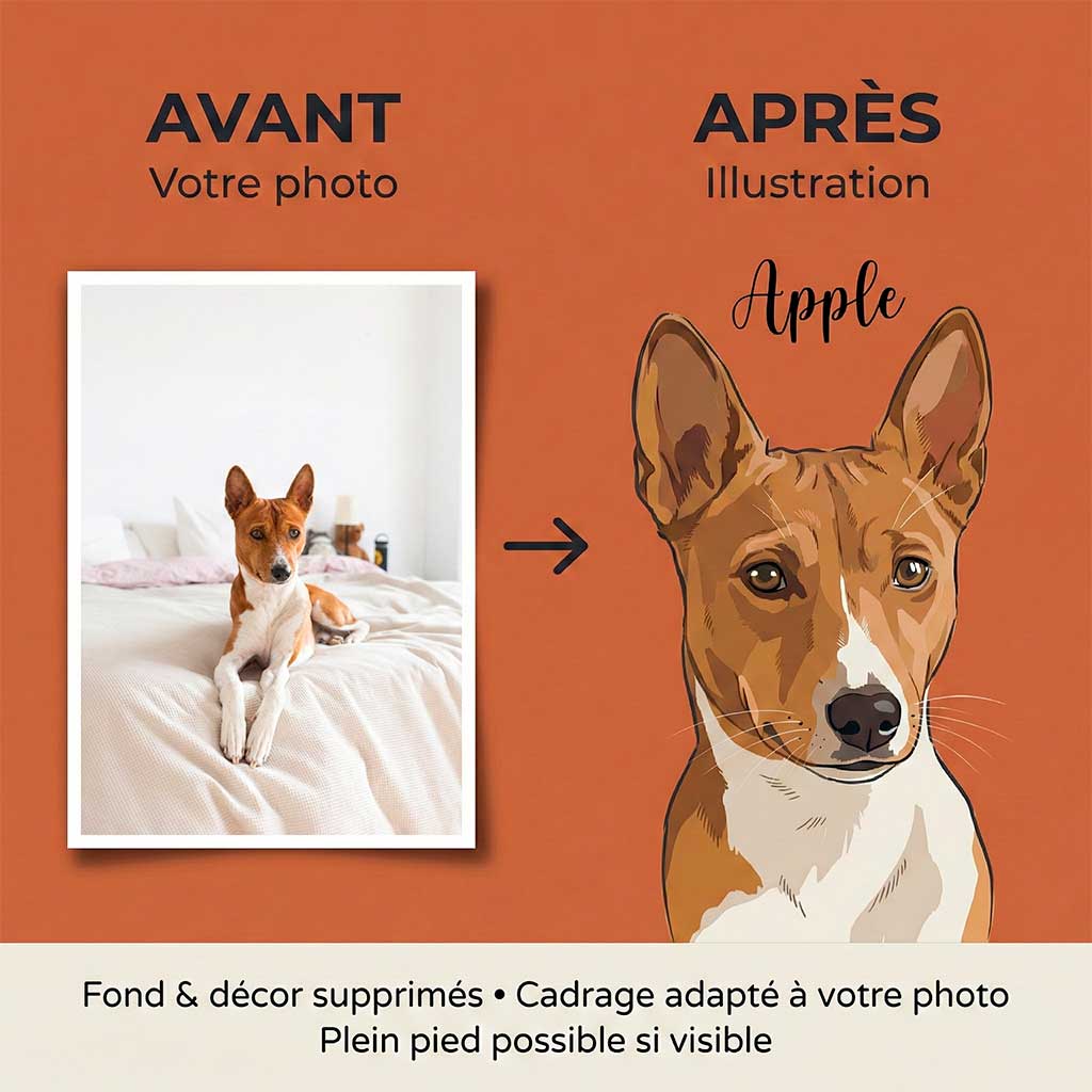 Un portrait moderne et tendance pour mettre à l’honneur votre chien, chat, lapin ou autre animal : une illustration au traité graphique en aplats de couleur, personnalisée à partir de votre photo.