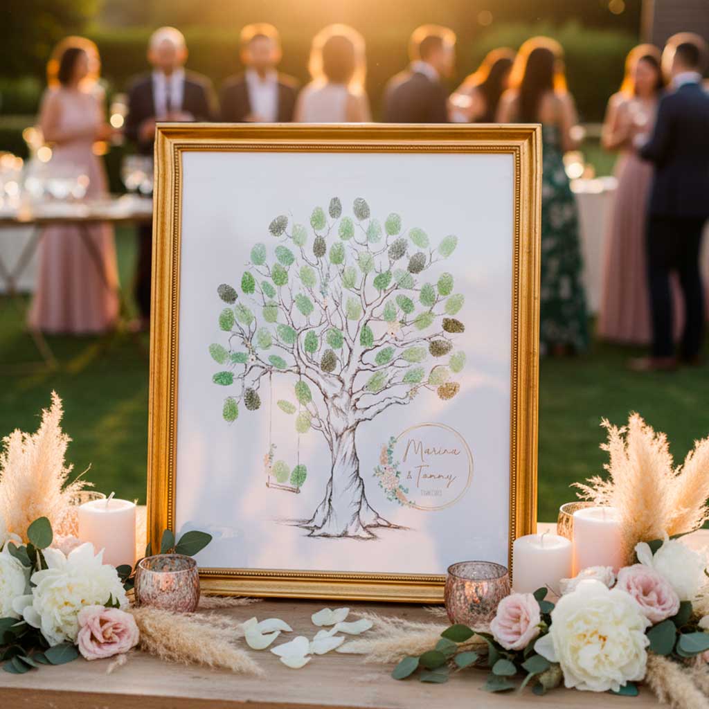 Arbre à empreintes mariage personnalisé avec les prénoms des mariés, la date du mariage aux airs bohème avec ses pampas et feuillages d'eucalyptus.