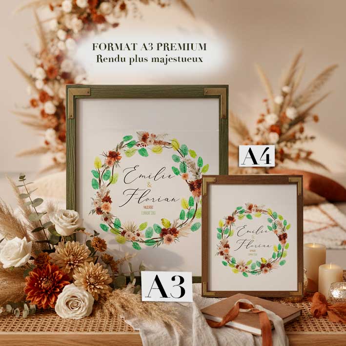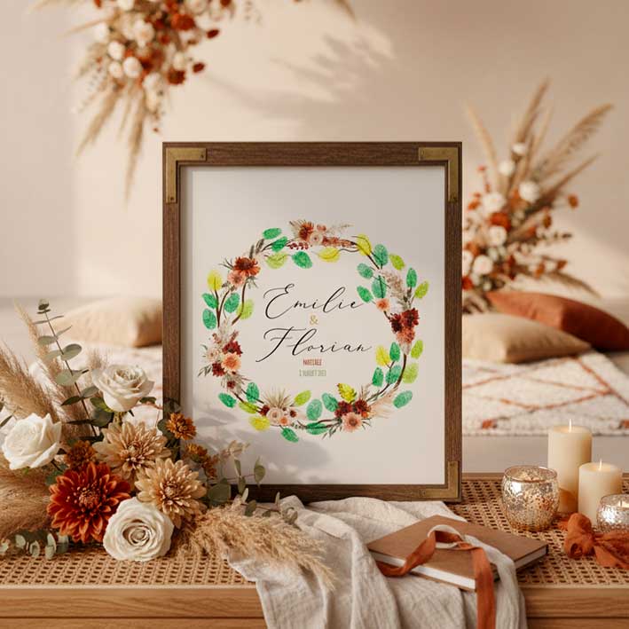 Arbre à empreintes mariage personnalisé avec les prénoms des mariés, la date du mariage aux airs bohème avec ses teintes terracotta, fleurs séchées et feuillages d'eucalyptus.