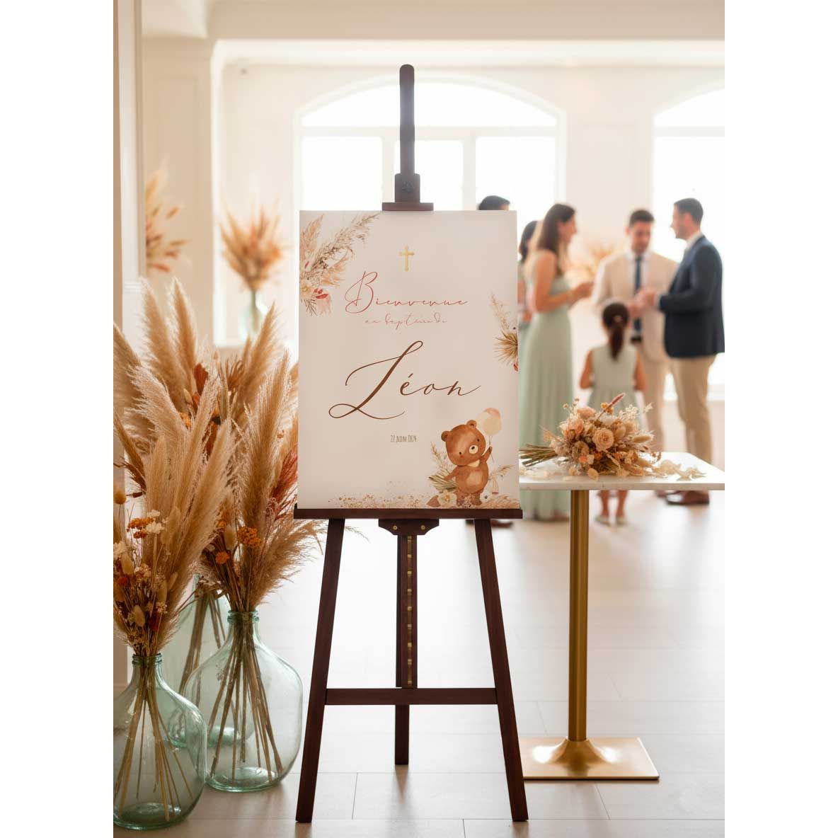 Affiche de bienvenue pour baptême – thème Ours & Pampas. Personnalise l’entrée de ta cérémonie avec une affiche douce et élégante, assortie à une déco naturelle (pampas, beiges, dorés). Idéal pour le coin accueil, le livre d’or ou le candy bar.